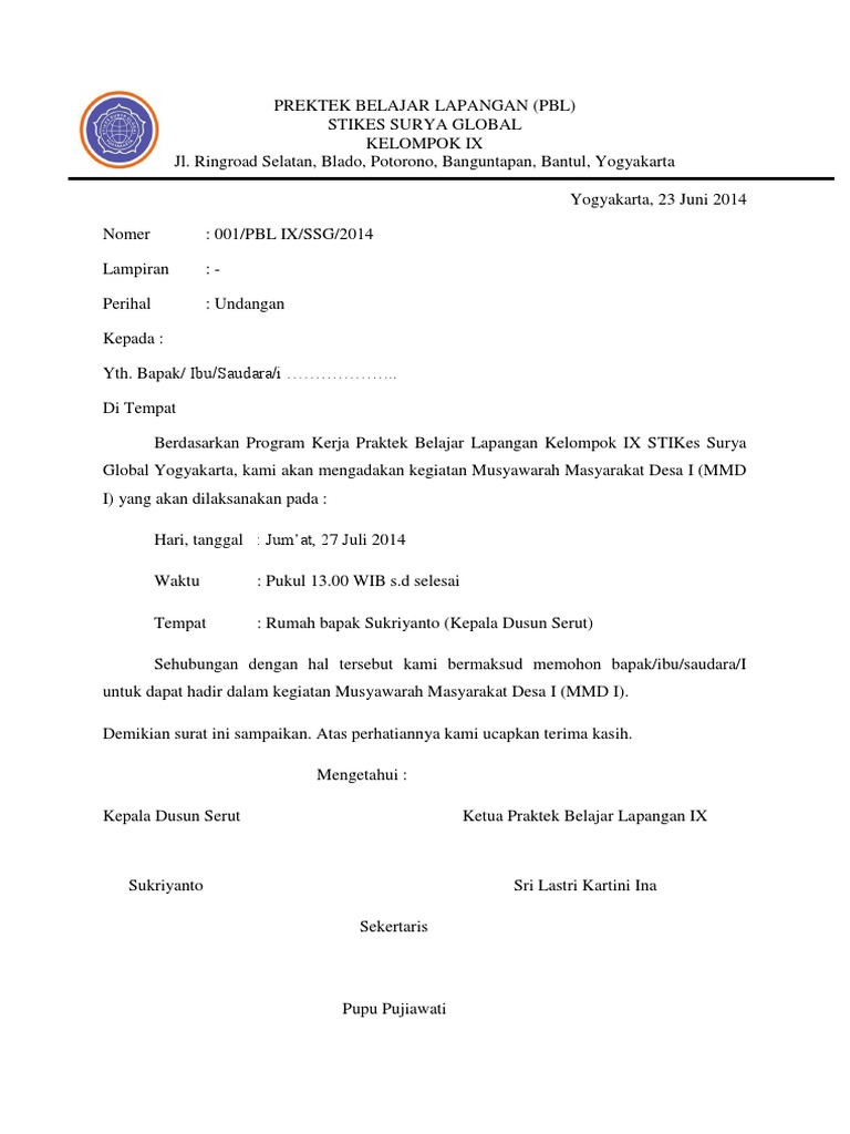 Dalam wilayah desa, biasanya membawahi beberapa rw ataupun rt. Contoh surat undangan rapat evaluasi pelaksanaan proyek. Adapun isi dari surat ini biasanya tidak jauh dari. Contoh surat undangan rapat desa. Dalam pelaksanaan suatu kegiatan rapat, kita tidak bisa begitu saja mengadakannya tanpa suatu. Semoga contoh surat undangan rapat ini bisa menjadi referensi dan bermanfaat dalam anda membuat surat dalam tanggung jawab anda mungkin karena sebagai. Ada berbagai contoh surat undangan dengan berbagai jenis kegiatan seperti. Akan dilaksanakan kegiatan musyawarah desa penetapan apbdes tahun anggaran 2017. Dalam rangka praktek kerja lapangan (pkl) mata kuliah komunitas ii mahasiswa d4 keperawatan komunitas jurusan keperawatan singkawang poltekkes kemenkes pontianak di rt 12 rw 06. Contoh surat undangan tahlil digunakan untuk mengundang saudara, tetangga, sahabat dan kerabat untuk datang ke kediaman kita dalam acara tahlilan. Surat jenis ini biasanya dikeluarkan oleh para mahasiswa yang memiliki kegiatan acara di luar kampus pada acara tertentu, atau bisa juga surat keputusan mandat mahasiswa dan lain sebagainya. Hal yang membedakan karena keduanya memiliki struktur yang berbeda dan untuk keperluan yang tidak. Demi kelancaran acara, diharapkan kehadiran bapak / ibu tepat waktu dalam rapat ini.