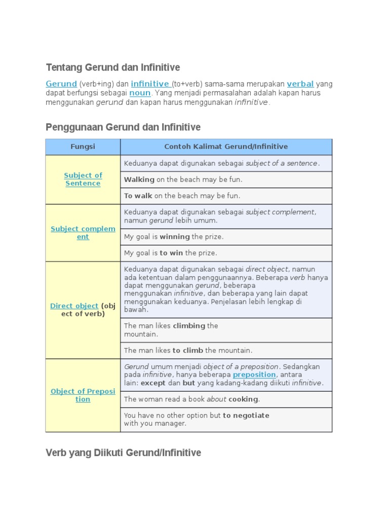 Dalam contoh kalimat ini, infinitive verb dengan to di depannya, yakni to understand (untuk mengerti) ditempatkan di depan, yakni sebagai noun subject pengganti dari subject sesungguhnya, yakni that subject (pelajaran itu). (dia (lk) terlalu mengantuk sehingga tidak. Diatas merupakan contoh yang termasuk dalam infinitive tanpa to atau bare infinitive, lalu bagaimana caranya mengaplikasikan bare infinitive tersebut dalam sebuah kalimat. Infinitive phares (ungkapan infinitive) biasa disebut infinitive saja terbentuk dengan kata di depan kata kerja. (opened, opens, to open, open) your book please! Contoh kalimat infinitive adalah suatu verbal yang terdiri dari particle to dan bentuk simple dari verb (bare infinitive) dimana dapat berfungsi sebagai noun, adjective, atau adverb. Not to drink milk makes emily weak. Perhatikan tulisan yang saya tebalkan pada contoh kalimat di atas, itulah infinitive phrase. Modal selalu diikuti dengan verb 1, sehingga rumus modals yang digunakan adalah to infinitive + seom seom + to infinitive. (want) i promise to help her to make her assignment. It was a very dangerous thing to do. To infinitive merupakan bentuk kata kerja (to + verb 1) yang difungsikan sebagai adjective, noun, dan adverb. Contoh kalimat gerund dan infinitive juga soal latihannya.